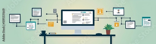 A modern workspace featuring a computer connected to various digital devices and data streams, illustrating a seamless workflow and information sharing.