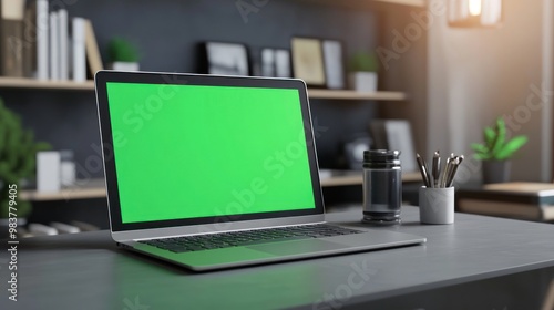 A modern workspace featuring a laptop with a green screen, surrounded by office supplies.