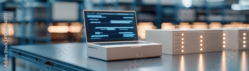 A modern workstation featuring an open laptop displaying code, surrounded by storage units, set in a tech-focused environment.