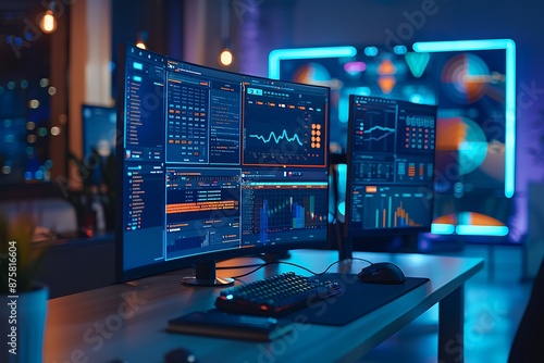 A Modern Workstation with Multiple Monitors Displaying Data and Charts