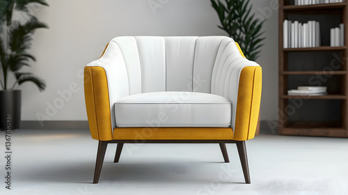 A modern yellow armchair with realistic 3D rendering, ideal for a cozy and comfortable office setting in indoor space design, complete with office interior furniture