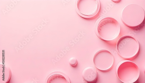 A monochromatic, top-down studio shot features an array of pink circles and spheres arranged on a pink background