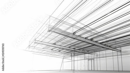 A monochrome digital sketch of a sleek hallway with glass walls and sharp lines reflects modern design and a sense of openness.