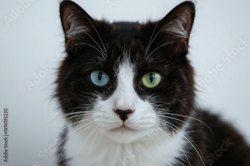 A monochrome feline with captivating heterochromatic eyes staring closely