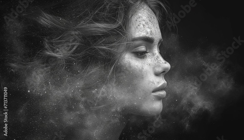 A monochrome young woman's profile portrait combined with abstract grainy digital art against black background,generative ai
