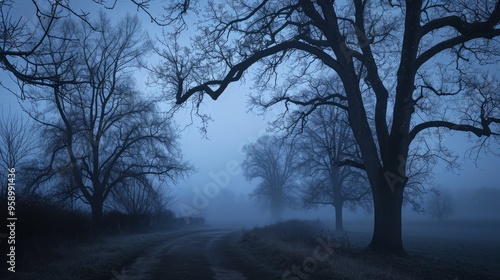 A moody photograph capturing the fading daylight as the surroundings are bathed in a soft, blue hue. The silhouettes of distant trees and the suggestion of a winding path create an atmosphere