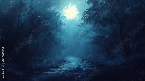 A moonlit forest path, mysterious, serene, with dark, imposing trees. Mystical ambiance