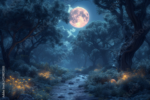 A moonlit forest with a path leading into the distance, leaving a mystical center for text. Concept of enchanted woodland journeys. Generative Ai.