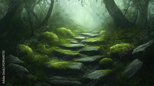 A mossy stone pathway disappearing into the depths of a mysterious forest.
