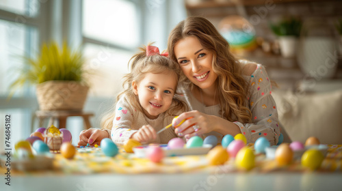A mother and daughter enjoying Easter egg painting together in a festive atmosphere. Ai generative illustration