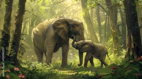 A mother elephant affectionately interacts with her calf in a vibrant, sunlit forest filled with abundant greenery and colorful flowers. Generative AI