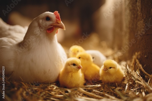 A mother hen sits in straw with a group of fluffy yellow chicks gathered closely around her in a warm, cozy setting.