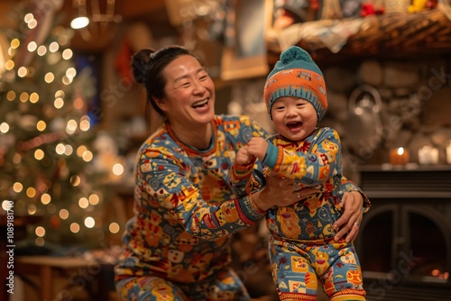 A mother in colorful pajamas laughs while holding her excited child dressed in matching festive attire. The cozy setting features a warm fireplace and a beautifully lit Christmas tree