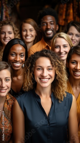 A multi-ethnic group of smiling coworkers stands together in vibrant fall colors, radiating team spirit
