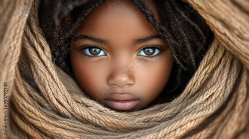 A multiracial little girl with striking eyes peers through thick ropes, exuding a sense of curiosity and innocence, creating a captivating ambiance