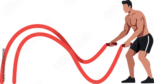 A muscular man exercising with battle ropes in a flat, minimal style vector illustration