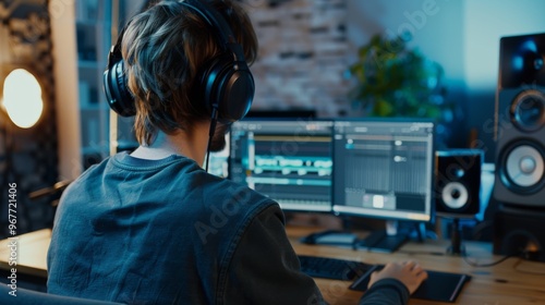A music producer works at a home studio, wearing headphones and concentrating on mixing tracks on dual screens.