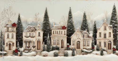 a muted, rustic looking, neutral coloured christmas scene with a rustic worn vintage frame around the outside