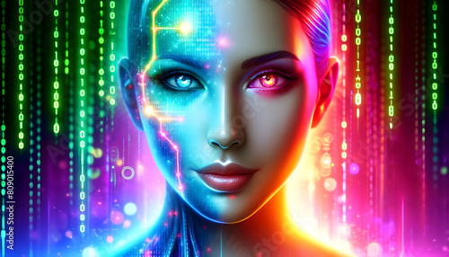 a mysterious and dramatic scene of a hacker, with her face partially obscured by streaming green binary code.