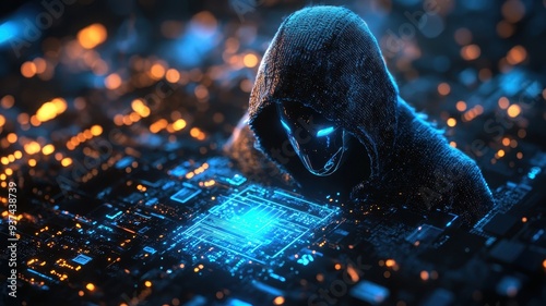 A mysterious figure in a hood surrounded by glowing circuitry, representing technology, hacking, and the digital world.