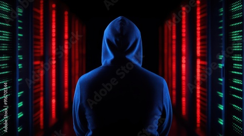 A mysterious figure in a hoodie stands in a dark server room, illuminated by vibrant red and green lights, symbolizing technology.