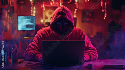 A mysterious male hacker in a hoodie, immersed in work on a laptop amid a vibrant, tech-inspired atmosphere.