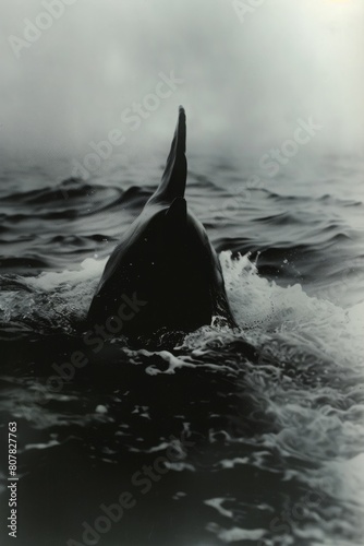 A mysterious narwhal breaches the surface under a bleached sky, in a hyperrealistic blend of modern and mystical colors.