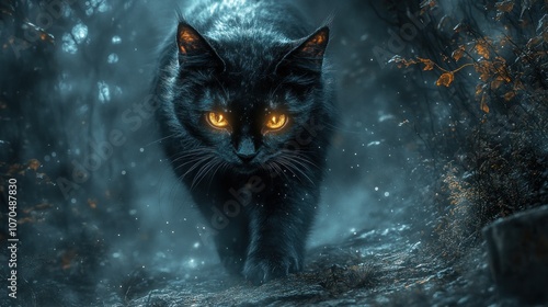 A mystical black cat with glowing eyes walks through a foggy forest.
