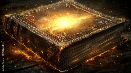 A mystical book radiating golden light, symbolizing knowledge and magic against a dark wooden backdrop.
