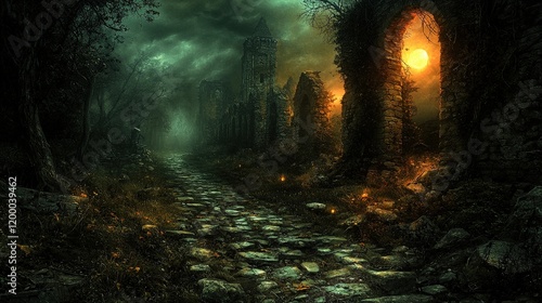 A mystical cobblestone path leads through a ruined abbey bathed in eerie moonlight. Fireflies illuminate the path to an unknown destination. Ideal for fantasy or gothic projects.