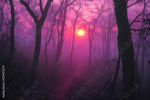 A mystical forest at sunset bathed in deep amethyst hues. The scene captures the enchanting glow of twilight with vibrant purple tones