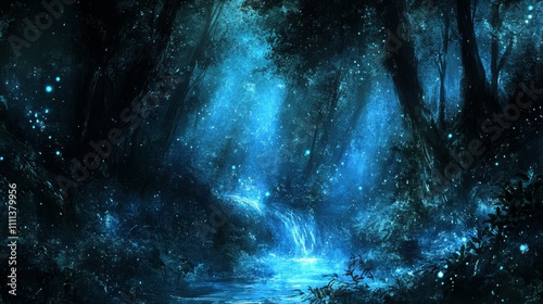 A mystical forest path illuminated by blue light with a stream flowing through it.