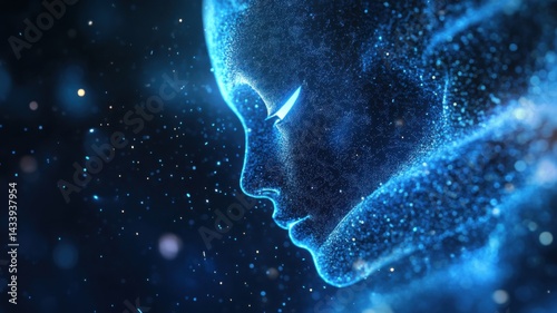 A mystical, glowing silhouette of a face composed of shimmering particles against a dark background, evoking a sense of depth and beauty.