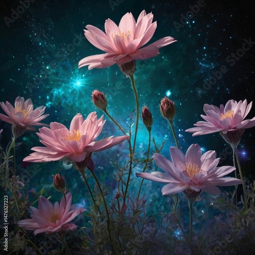 A mystical, iridescent garden suspended in the velvety blackness of space, where glowing, ethereal plants with delicate, swirling patterns and energy flowers in shimmering hues of soft pink, lavender,