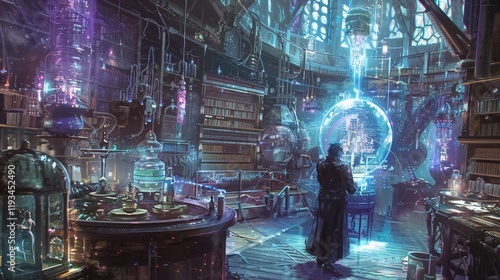 A mystical library filled with glowing shelves and advanced scientific equipment. A cloaked figure stands in front of a spherical projection emitting blue light, surrounded by various glass apparatuse