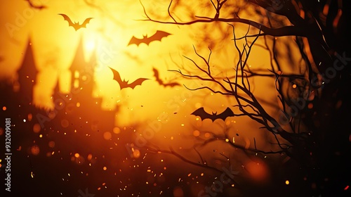 A mystical orange sunset with flying bats and eerie silhouettes of trees, creating an enchanting Halloween atmosphere.