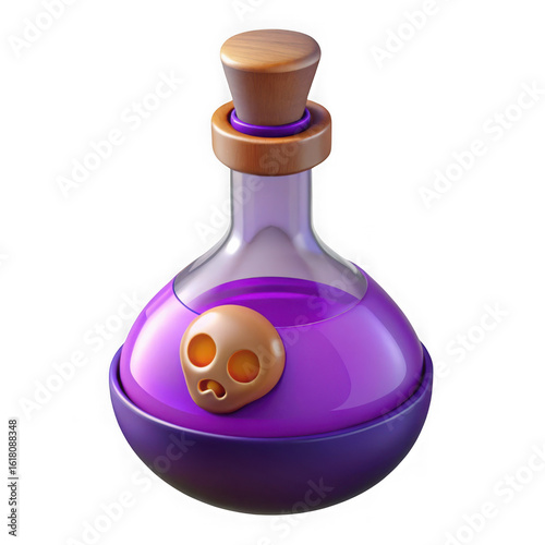 A mystical purple potion with a skull emblem in a glass bottle with a cork stopper isolated on transparent background