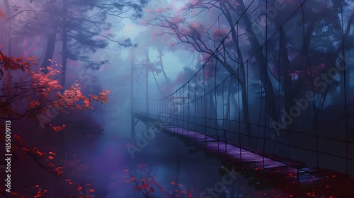 A mystical suspension bridge shrouded in fog with vibrant autumn foliage, creating a dreamlike and enchanting forest scene.