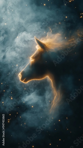 A mystical unicorn silhouette glows softly against a dark, ethereal backdrop filled with stars and swirling mist.