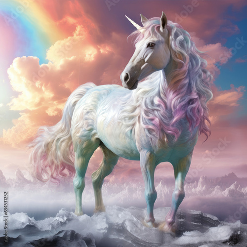 A mystical Unicorn with a magical horn and eyes against a fantasy rainbow pastel backdrop conveys enchantment and wonder.