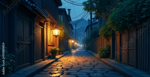A narrow pathway lined with lanterns, casting a warm, inviting glow. The path winds through an urban neighborhood, creating a nostalgic and dreamy atmosphere. anime