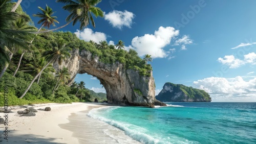 A natural arch on a tropical island, surrounded by palm trees and white sandy beaches.