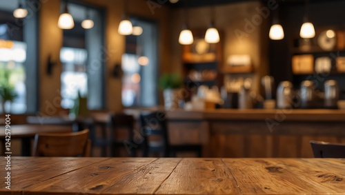 A natural wooden tabletop positioned for product display, with a blurred abstract coffee shop background