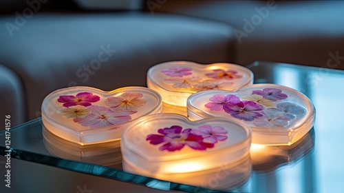 A neat design of Valentine's pressed flower coasters with heart-shaped patterns in transparent resin
