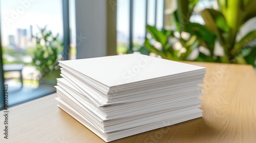A neat stack of blank paper sits on a wooden desk, surrounded by greenery and a bright view, suggesting a peaceful, productive workspace.