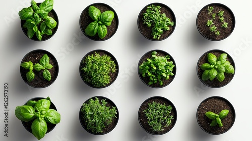 a neatly arranged herb garden, fragrant basil, rosemary, and thyme in sunlight, topdown view, isolated on white background