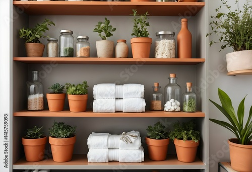 A neatly arranged shelf featuring potted plants, glass jars with herbs and grains, and folded white towels, set against a modern backdrop with terracotta accents.