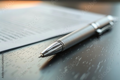 A neatly folded contract rests on a smooth matte black desk, with a silver pen placed atop, illuminated by soft light