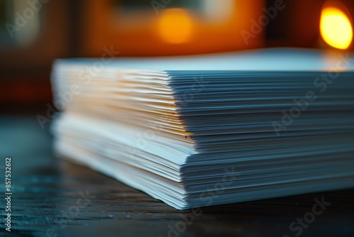 A neatly organized stack of crisp white paper sheets sitting on a wooden table, reflecting a warm ambient glow in a cozy indoor setting