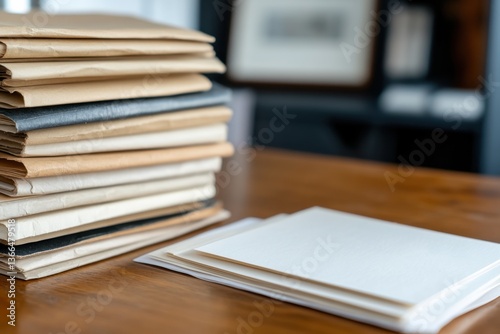 A neatly stacked collection of vintage papers rests on a wooden table, suggesting nostalgia, creativity, and the beauty of written documents from a bygone era.